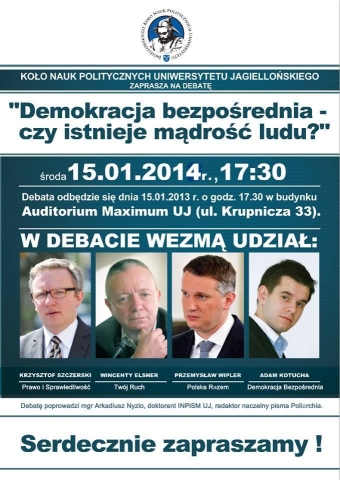 Odpowiedzi na te pytania będziecie mieli okazję poznać podczas debaty "Demokracja bezpośrednia - czy istnieje mądrość ludu?", organizowanej 15.01.2014 r. przez Koło Nauk Politycznych Uniwersytetu Jagiellońskiego.