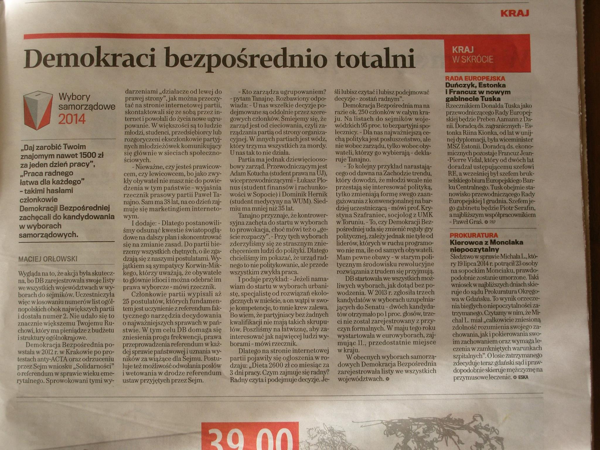Cały tekst: » http://wyborcza.pl/1,75478,16893797,Demokracja_Bezposrednia_startuje_w_wyborach_do_sejmikow.html#ixzz3Hjke0Vyu