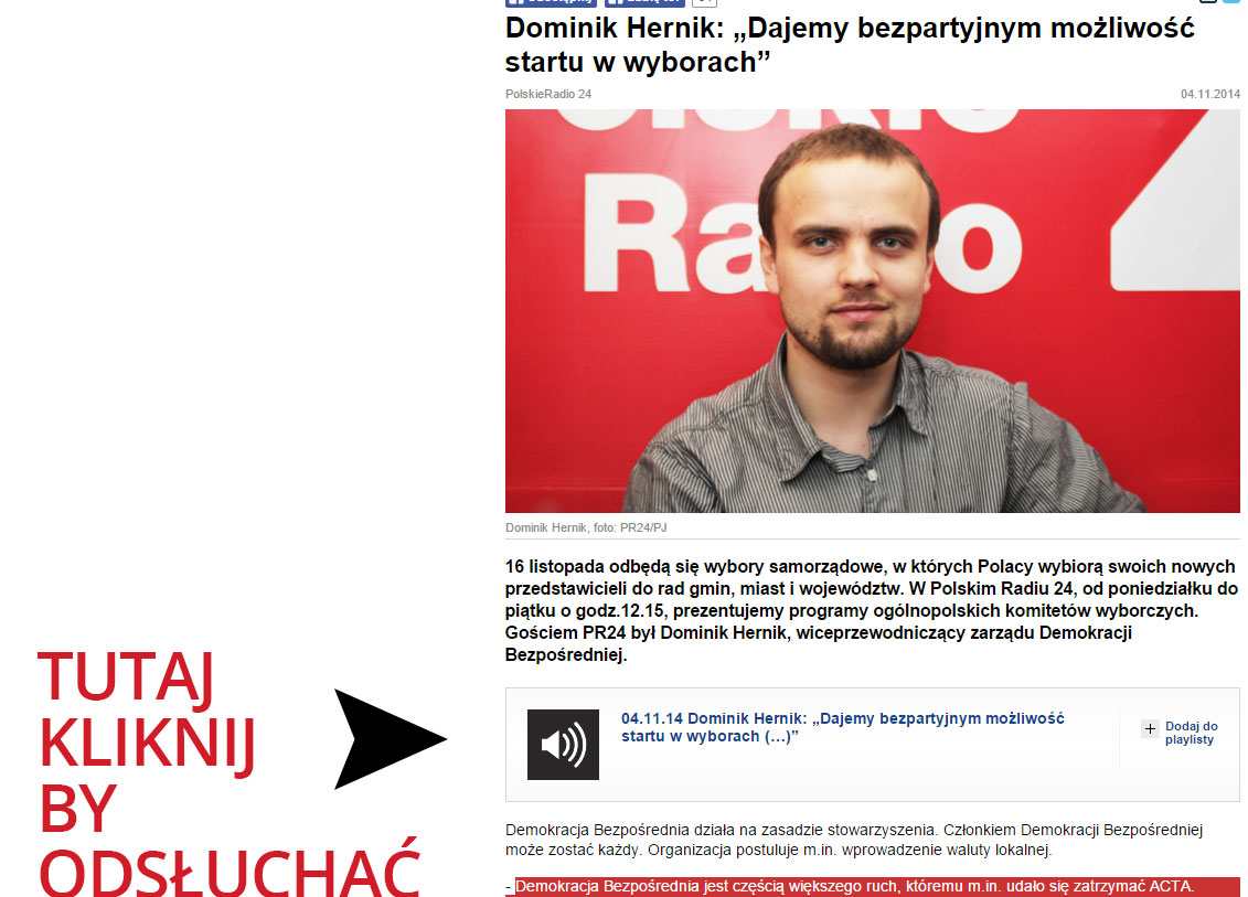 Aby odsłuchać całą audycję kliknij tutaj : » http://www.polskieradio.pl/7/473/Artykul/1273085,Kandydat-Demokracji-Bezposredniej-do-sejmiku-trzeba-zmienic-podejscie-politykow-do-obywateli