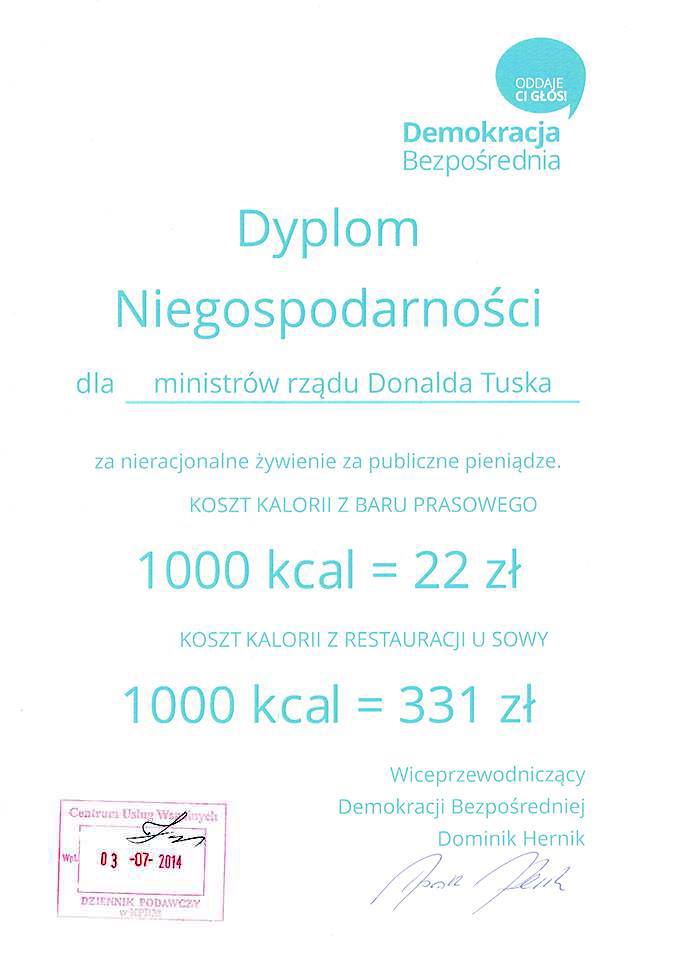 Dlatego właśnie w czwartek, członkowie Demokracji Bezpośredniej w imieniu wszystkich, którym bliska jest idea państwa obywatelskiego i posłusznych oraz skromnych urzędników, postanowili dać wyraz swojemu oburzeniu i wręczyli rządowi DYPLOM NIEGOSPODARNOŚCI.
